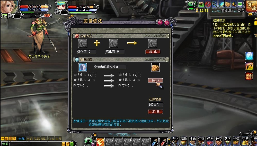 角色可以在机械城区(24,38)与NPC装备炼化使者对话,使用装备炼化功能。装备炼化功能中包含装备炼化和属性升华两个子功能。