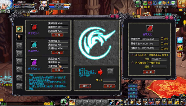 咒文宝石提供三条属性,宝石的初始只开启一条属性。激活和淬魔能强化咒文宝石属性,激活或者淬魔消耗魔石或者金币(魔石由原石转化)。