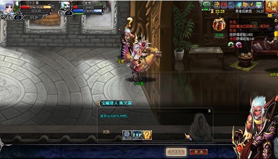 在宝藏猎人 斯文森处接领藏宝图和高级藏宝洞任务,会得到“藏宝猎人的指引”和“高级藏宝图”道具,使用“藏宝猎人的指引”后会得到“宝藏猎人追缉令”。根据指引完成指定地图杀死暗雷怪物的任务后,可获得经验、金钱和藏宝图道具的奖励,每天可接取完成10次寻宝任务。高级藏宝洞任务可以直接获得1个高级藏宝图,双击左键使用高级藏宝图可以传送到高级藏宝洞副本。击杀宝藏主人可以获得宝箱钥匙,钥匙开启宝箱可以获得配方、宠物技能书等奖励。