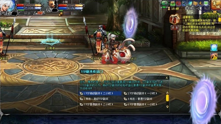 已激活VIP的玩家可以通过在誓言城北一区(71,34)的VIP副本传送门,可进行VIP副本时间的兑换,根据个人需要选择充入VIP普通副本或高级VIP副本时间1或2小时,充入VIP时间后,即可传送至相对应的副本中。