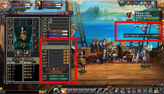 点击公告栏下方的加点提示图标,打开人物界面,鼠标点击“+”、“-”按钮可自由分配潜力点,分配完成后,点击“确定”按钮。一旦确定,将无法调整潜力点的分配,只能通过特殊道具来进行洗点。